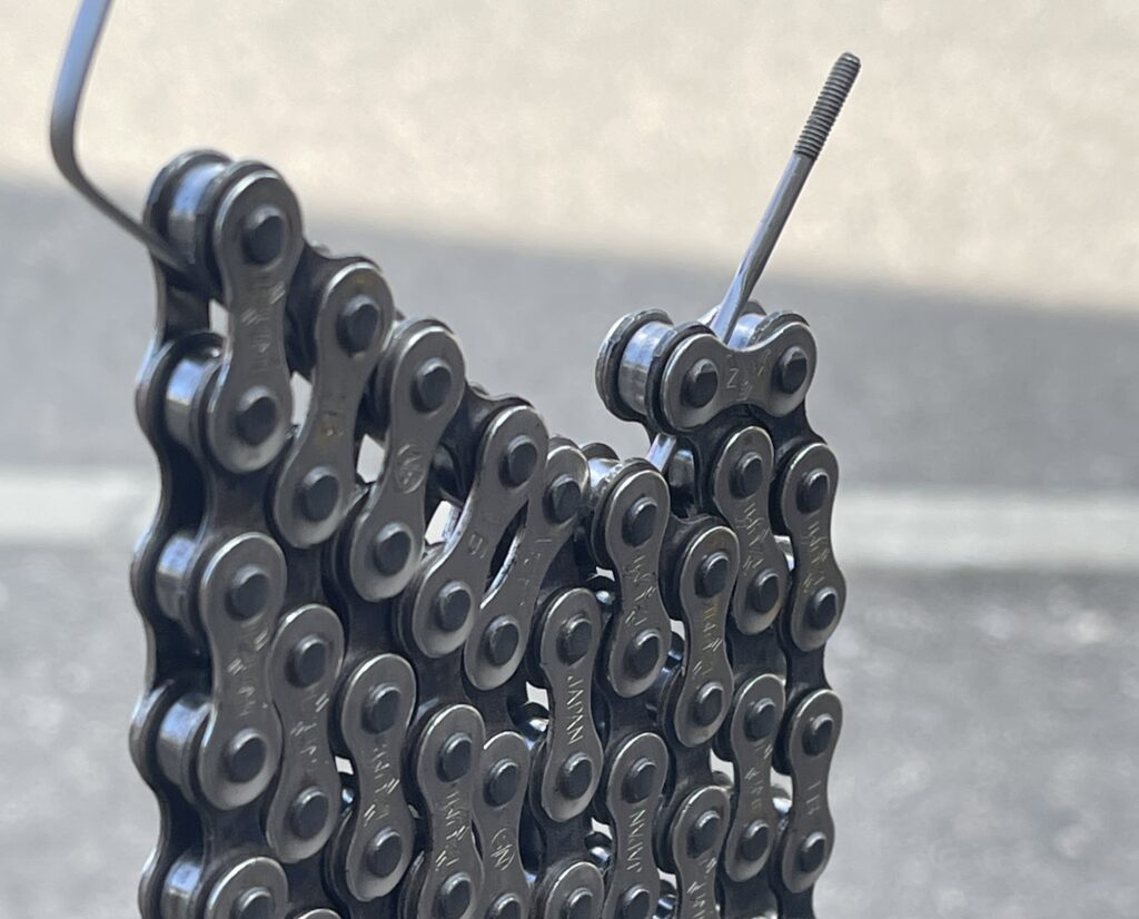 その前にいらないスポークなどにチェーンを折りながら通しておきます。