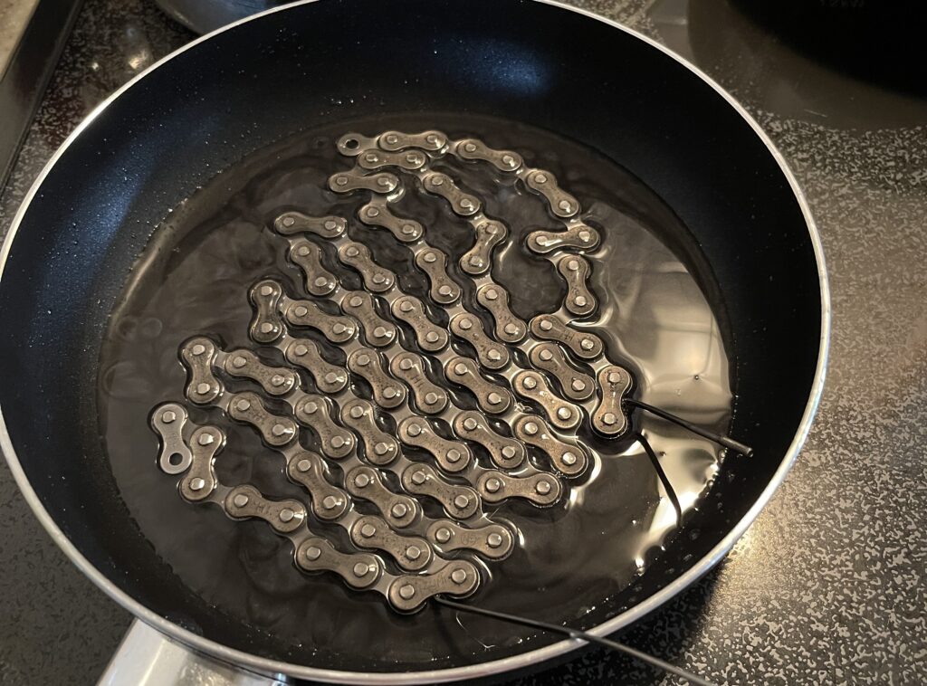タッパーにディグリーザーとチェーンを入れて放置、たまにガシャガシャと動かして放置、そして歯ブラシで丁寧にシャカシャカする、を×3回やりました。
