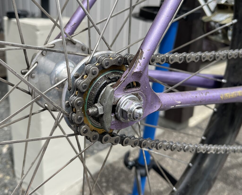固定ギアなのでサドルを持って後輪を上げてペダルを蹴ればしばらく後輪が回ってるので、そこに大雑把にチェーンルブをだらだらと垂らして「はいっ、施工完了!」ってやってたわけです。